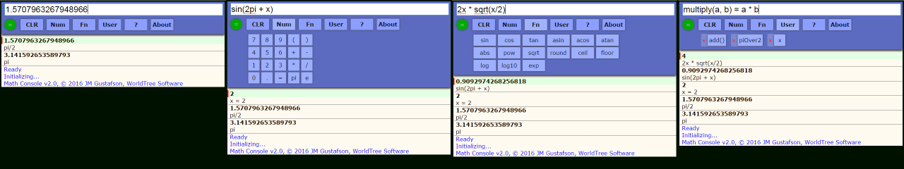 Math Console is a simple yet powerful calculator with user defined variables and functions. It is designed to be used by devices with keyboards. Rather than focusing on a keypad interface Math Console lets you use your keyboard to quickly enter and evaluate complex mathematical expressions.