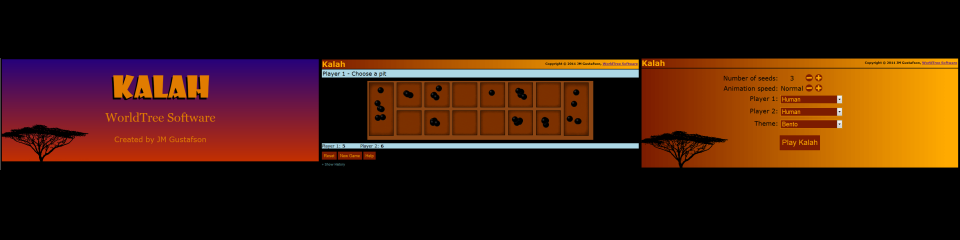 Kalah, also known as Mancala or Warri, is an ancient board game where players sow seeds around the board trying to capture more seeds than their opponent. Play against a friend or the computer. (more...)